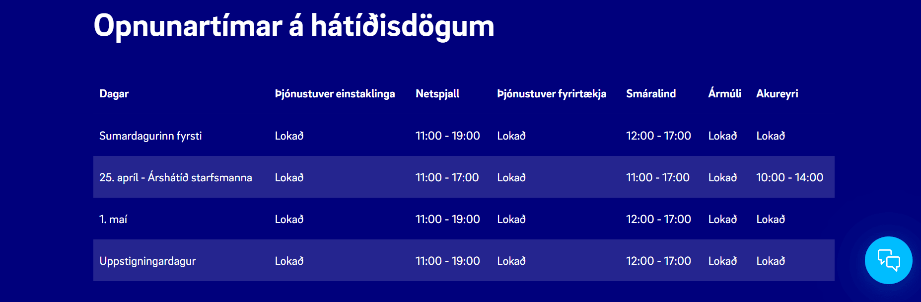 Starfsmenn Símans ætla að eiga gleðilega stund saman á árshátíð, laugardaginn 25. apríl. Verslun okkar í Smáralind verður opin frá kl. 11-17 (lokar fyrr en venjulega). Opið verður í verslun á Akureyri frá kl. 10-14. Netspjallið verður opið frá kl. 11-17.