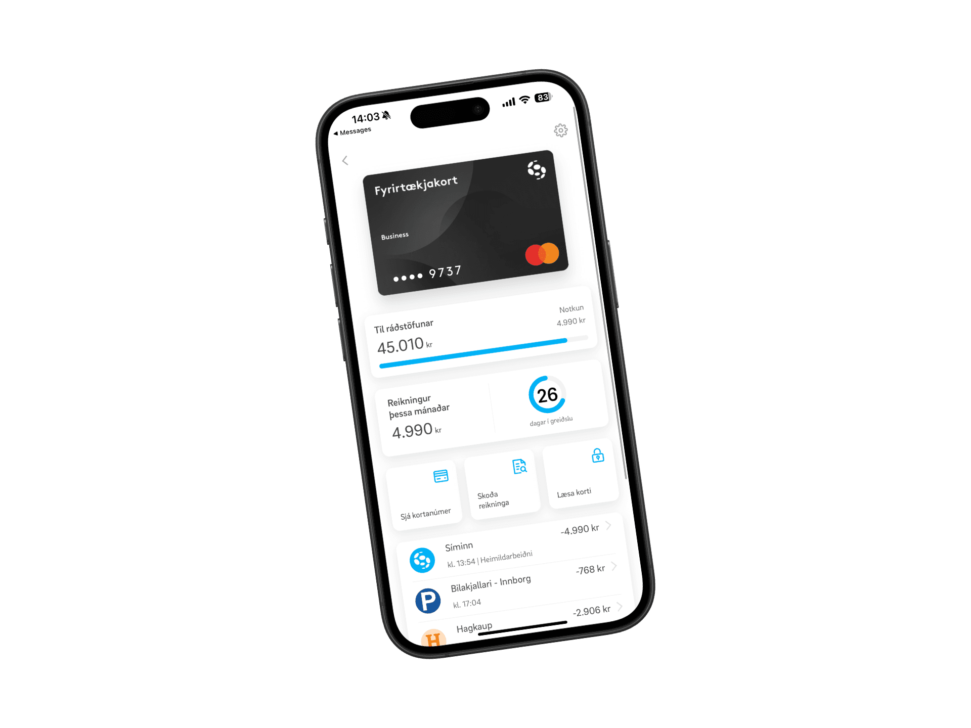 Fyrirtækjakort Síminn Pay er nútímalegt kreditkort sem einfaldar útgjöld fyrirtækja með öruggri aðgangsstýringu, fullkominni yfirsýn og skilvirkari flokkun. Kortið er stafrænt og auðvelt er að stofna ný kort, til lengri eða styttri tíma. Ferlið er einfalt; taktu mynd, flokkaðu færsluna og hún bókast beint í bókhaldið.